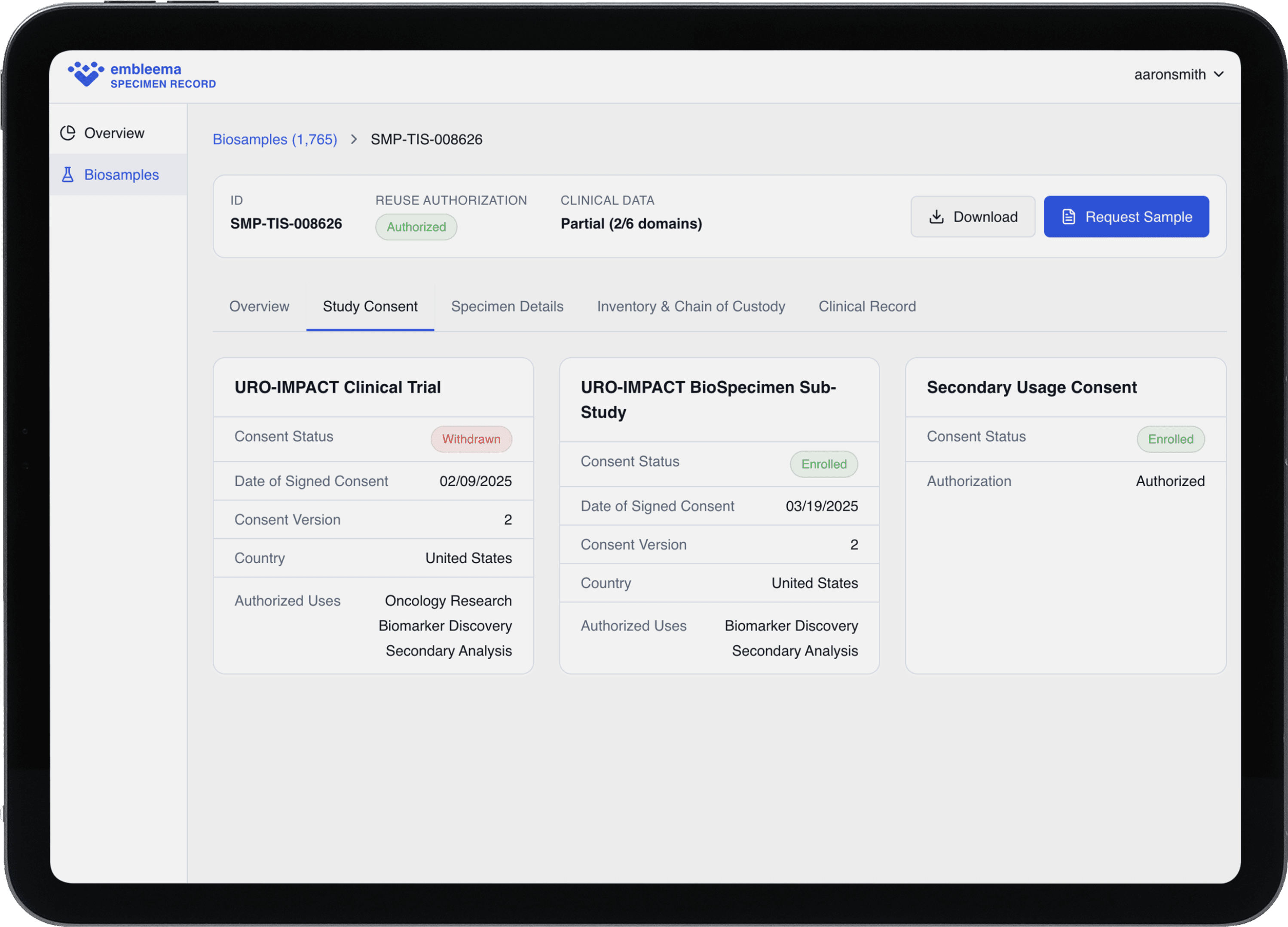 Consent status linked to biospecimen and clinical metadata