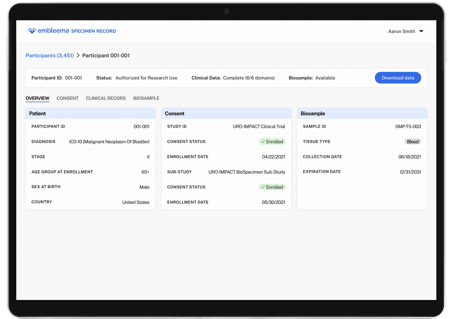 One record that unifies consent, participant, clinical, and sample data
