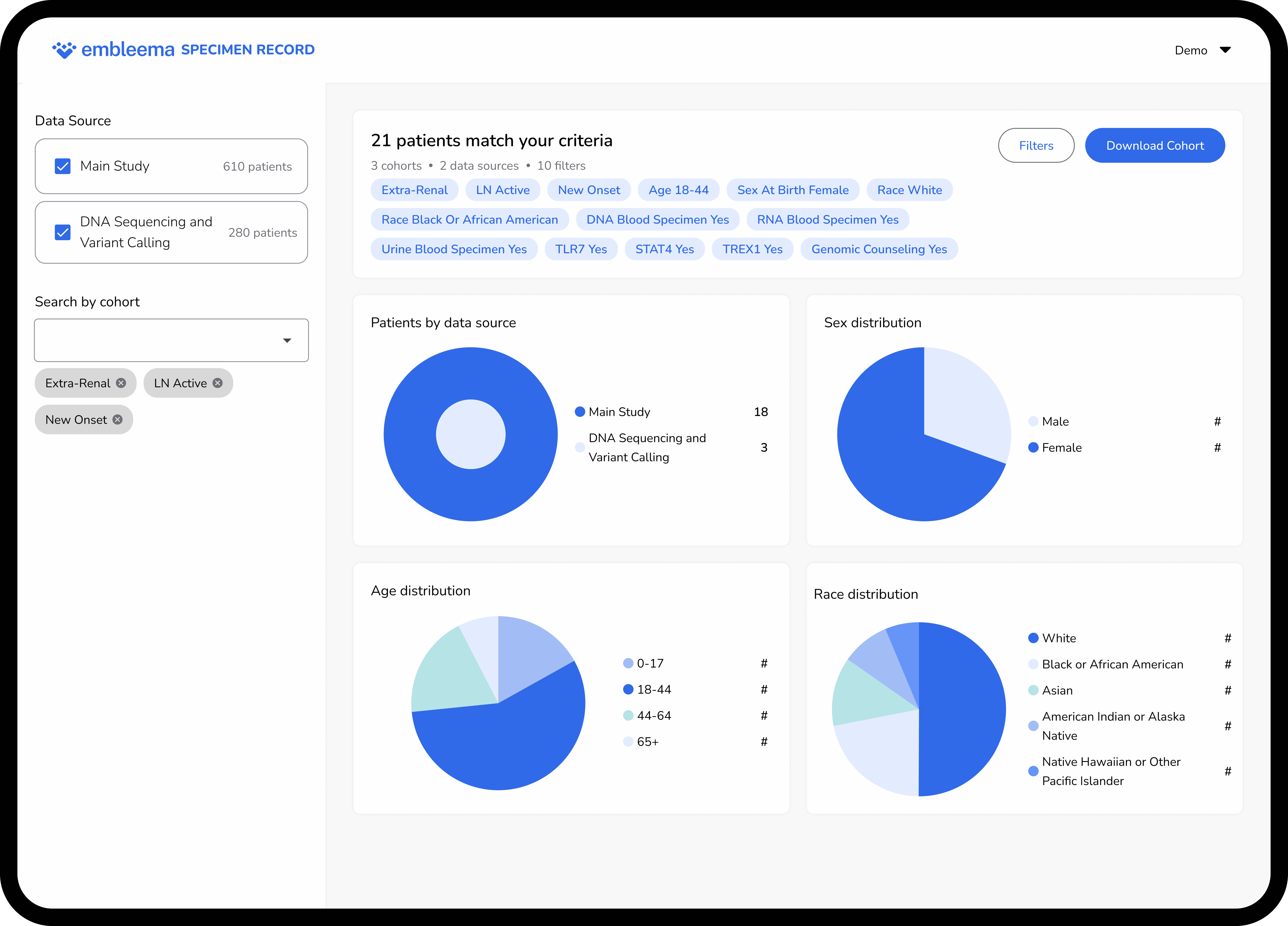 Embleema centralizes clinical, patients, and sample data collection data built on a real-time consent management platform, creating a completely clinically characterized digital profile for every sample.